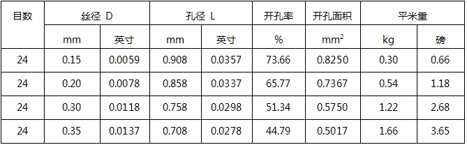 24目平纹编织黄铜网规格参数