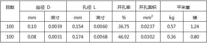 100目平纹编织镍网,即1英寸里有100根丝和孔。采用0.08-0.10mm线径,通过平纹编织工艺,编织100目网孔,可实现0.15-0.17mm之间的固体颗粒筛选,也可作为液体、气体过滤使用。这种网丝径与网孔的配比较合理,因此编织结构非常牢固。整个编织历经13道工序,使网面平整度较好。