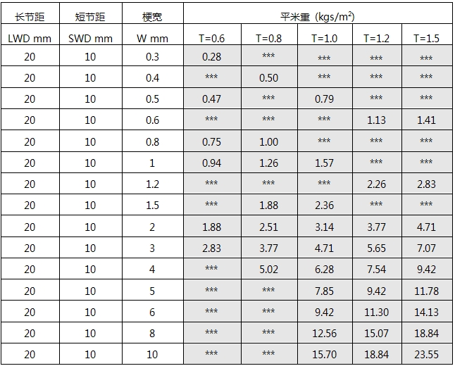 20x10mm网孔轻型钢板网是由0.6-1.5mm板厚的金属板材经过钢板网冲剪机加工处理后,拉伸而成的具有20x10mm网眼的菱形钢板网。具有重量轻,网孔小,板厚薄,轻便耐用等特点。多用于汽车隔栅(汽车中网),过滤滤芯,高档音箱网罩,工艺装饰,儿童座椅、筐、篮,办公室用品,屋顶用网。