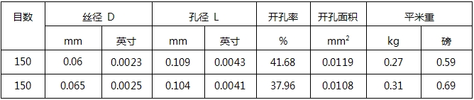 150目平纹编织不锈钢网,适配0.06-0.065mm线径,通过平纹编织方法,实现了0.104x0.104mm-0.109x0.109mm范围的方孔网格,达到了37.96%-41.68%的开孔率,产品经历13道编织工序,花纹整齐,网面富有弹性,其特有的平纹编织结构,实现了网孔相对精度和牢固度。在固体颗粒筛选、液体和气体粗过滤、保护防护面料的使用方面,发挥着巨大作用。
