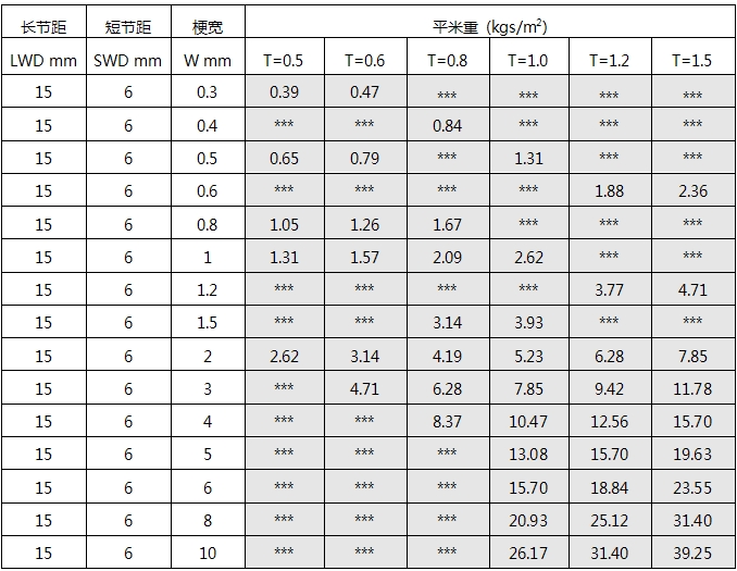 15x6mm网孔轻型钢板网是由0.5-1.5mm板厚的金属板材经过钢板网冲剪机加工处理后,拉伸而成的具有15x6mm网眼的菱形钢板网。具有重量轻,网孔小,板厚薄,轻便耐用等特点。多用于汽车隔栅(汽车中网),过滤滤芯,高档音箱网罩,工艺装饰,儿童座椅、筐、篮,办公室用品,屋顶用网。